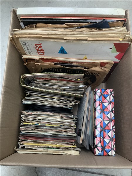 Cartone contenente numerosi vinili di musica classica e pop (difetti)