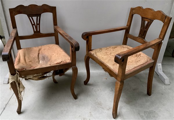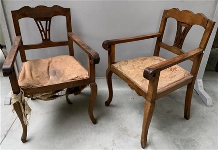 Coppia di poltroncine da camera con schienale a giorno e seduta imbottita (gravi difetti)