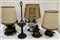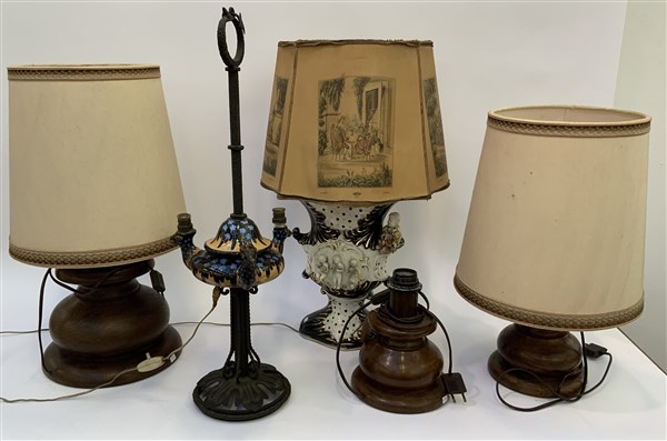 Lotto composto da cinque lampade da tavolo, di cui tre in legno e due in ceramica e ferro, fatture e dimensioni differenti (difetti e mancanze)