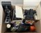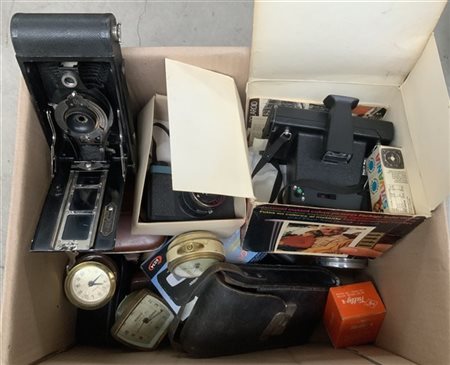 Cartone contenente numerose sveglie e macchine fotografiche, epoche differenti