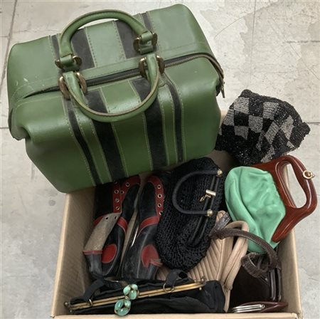 Cartone contenente numerose borse per signora e una coppia di pattini per ghiaccio (difetti)