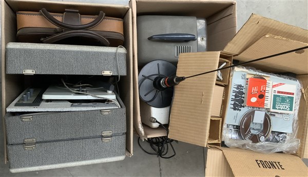Lotto di due cartoni contenenti un giradischi, una macchina per scrivere, un proiettore, una moviola portatile, un registratore Geloso e un'antenna (difetti)