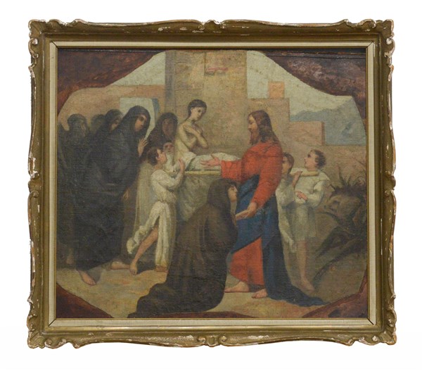 Scuola del secolo XIX " Scena religiosa" Frammento ad olio su tela sagomata inc