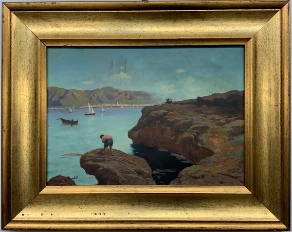 "Marina" olio su tavola (cm 27x39), firmato in basso a sinistra, in cornice (difetti e restauri)