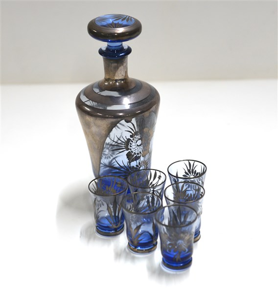 Manifattura dell'inizio del sec. XX. Servizio da rosolio in vetro decorato con foglia d'argento e motivi floreali composto da bottiglia con tappo e sei bicchierini (difetti)