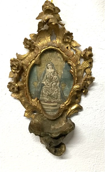 Acquasantiera in legno intagliato e dorato con fiori, carigli, contiene stampa
