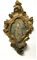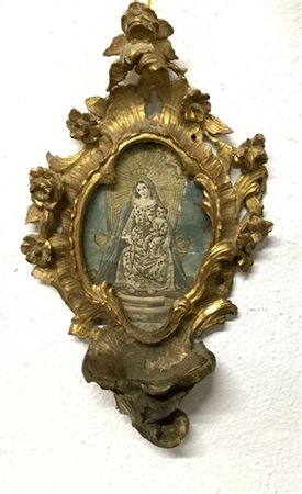 Acquasantiera in legno intagliato e dorato con fiori, carigli, contiene stampa sec. XVIII (cm 33x19) (difetti)