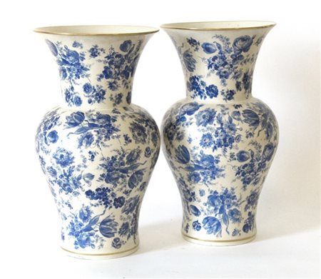 Coppia di vasi a tromba in porcellana a fondo crema, decorazione a mazzi di fiori in blu (h cm 43)
