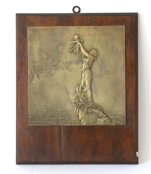 "Madonna con Bambino" bassorilievo in bronzo (cm 34 x 33), firmato in basso al centro, montato su pannello in legno (difetti)