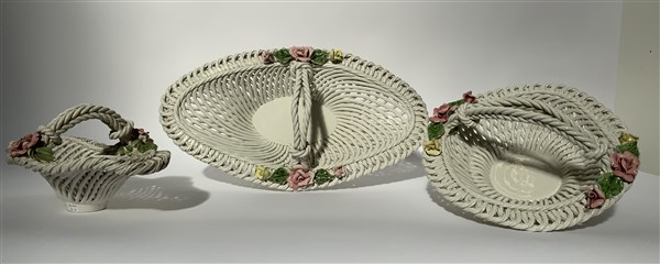 Gruppo di tre cestini in ceramica bianca intrecciata decorati con rose dipinte (l max cm 45) (difetti e mancanze)
