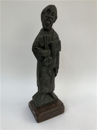Scultura in bronzo raffigurante San Pietro su base in legno (h tot cm 50) (difetti)