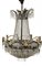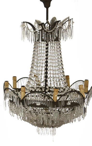 Lampadario a cesto con struttura in metallo dorato decorato da perlinature e gocce in vetro (h cm 90) (difetti e mancanze)