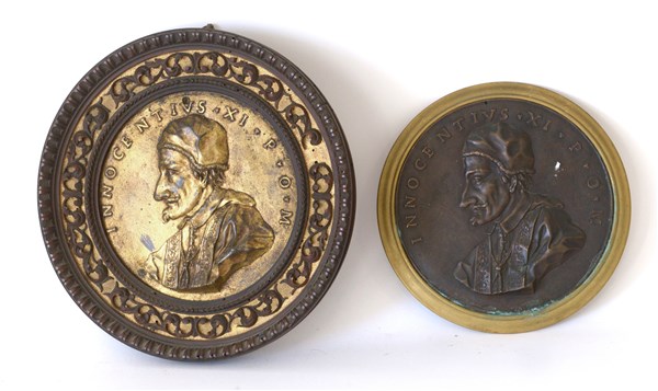 Lotto di due placche tonde in bronzo e metallo raffiguranti profilo di Papa Innocenzo XI, una in cornice di legno (difetti e mancanze)