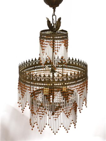 Lampadarietto a tre luci con struttura in metallo traforato decorato da canne in vetro (h cm 60) (difetti e mancanze)