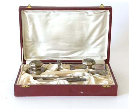 Servizio da scrittoio in argento composto da sette pezzi, in custodia (difetti)