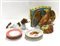 Lotto composto da una mensola decorata con aquila in ceramica policroma, una scultura raffigurante cane e nove piatti in porcellana di decori e manifatture diverse (difetti)