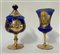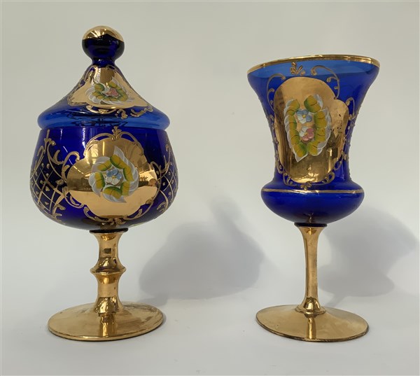 Lotto composto da un calice e un portacaramelle in vetro blu con decori dorati a fiori e volute (h cm 26) (lievi difetti)
