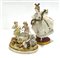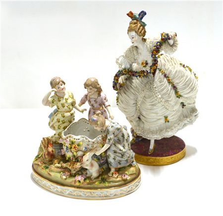 Manifatture diverse del secolo XX, lotto composto da un gruppo raffigurante fanciulli ed una scultura raffigurante gentildonna, in porcellana decorata in policromia (h max cm 36) (difetti)