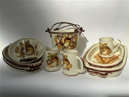 Parte di servizio da tavola in ceramica dipinta con frutti e motivi naturalistici, composta da quattro boccali, due paioli, due pirofile e tre piatti da portata (difetti)