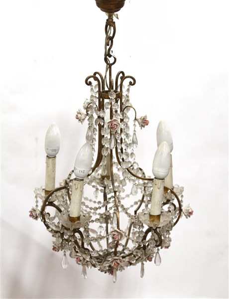 Lampadarietto in metallo dorato a cinque luci decorato da perlinature in vetro e fiori in porcellana (h cm 60) (difetti e mancanze)