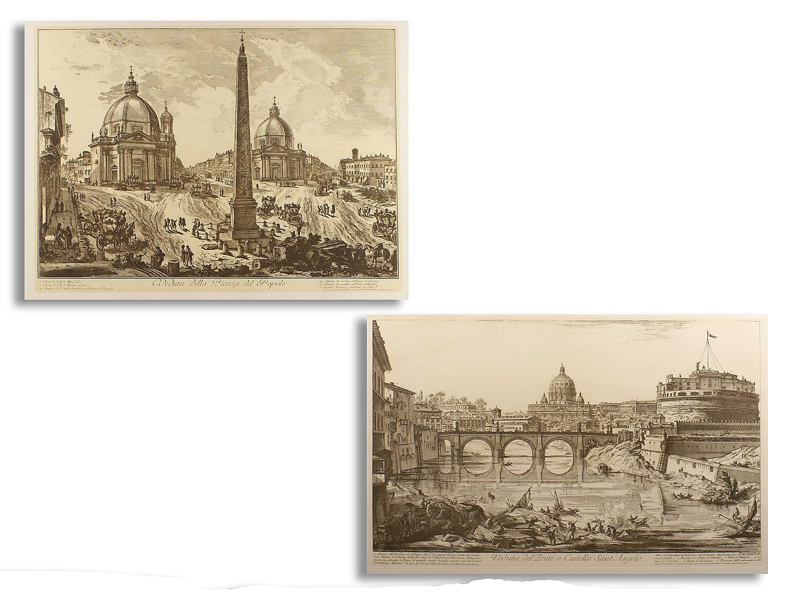 SCUOLA ITALIANA fine del XIX Sec. "Veduta di Piazza del Popolo e del Ponte di Castel S. Angelo- Roma", coppia di stampe entro cornici Dim. 40x55 cm.