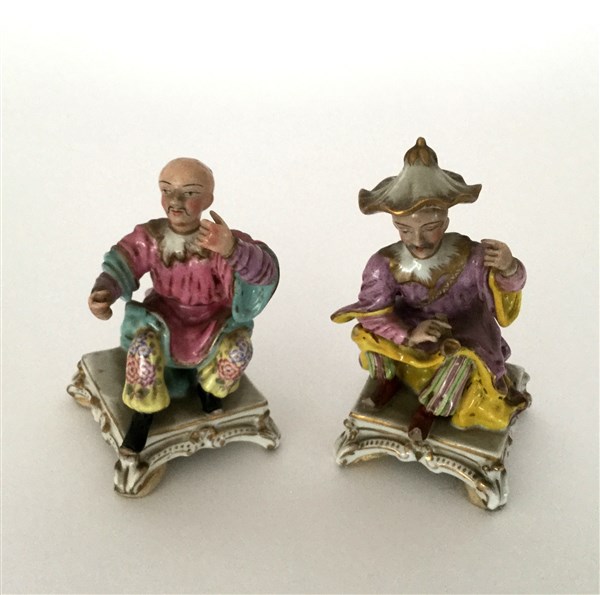 Lotto di due figure orientali in porcellana dipinta in policromia (h cm 12). Francia, secolo XIX. Etichetta Antichità Franzin sotto la base