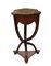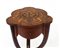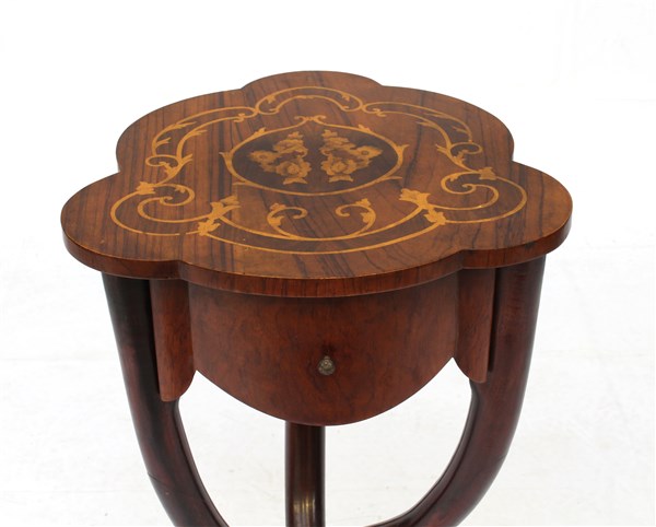 Tavolino in legno con piano polilobato intarsiato a motivi floreali, gambe rast