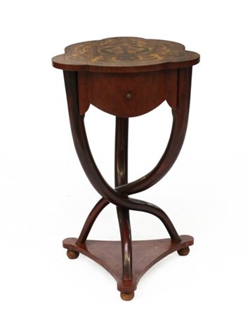 Tavolino in legno con piano polilobato intarsiato a motivi floreali, gambe rastremate intrecciate poggiante su base. (cm 44x74x45) (lievi difetti)