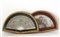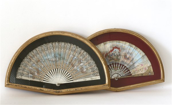 Lotto di due ventagli di stecche in avorio, uno con pagina in pizzo dipinto, l'altro con pagina in carta decorata da stampa policroma, in custodie (difetti)