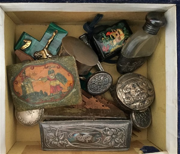 Scatola contenente numerosi oggetti diversi in argento e lacca (difetti)