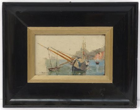 Carlo Brancaccio "Marina con barche" olio su tela applicata su cartoncino (cm 1