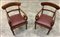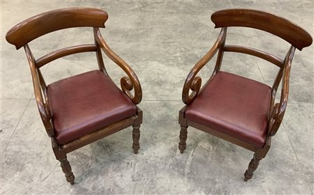 Coppia di poltroncine inglesi in mogano con schienali a giorno, braccioli ricurvi a ricciolo, gambe anteriori tornite, posteriori a sciabola (lievi difetti e mancanze)