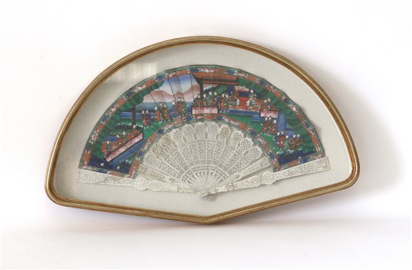 Arte orientale, ventaglio con stecche in avorio traforato e pagina dipinta con scene di vita di corte, in teca (difetti)