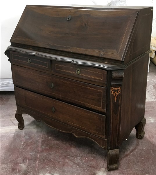 Antica ribalta a due cassetti in linea sottopiano più due grandi. Anta ribaltabile celante cassettini e vani. Fasce e piedi sagomati. (cm 117x118x60) (difetti)