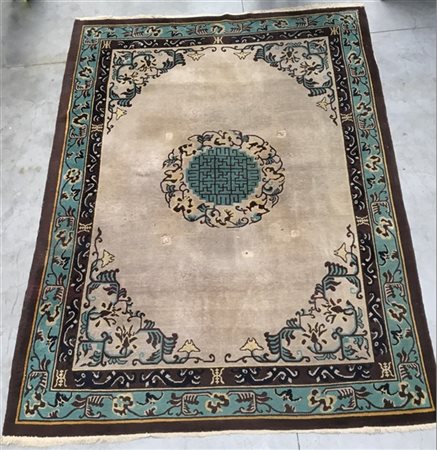 Tappeto Sparta Turchia sec. XX decoro cinese con medaglione tondo nei toni del verde acqua beige e marrone su fondo nocciola (cm 330x245) (difetti e mancanze)