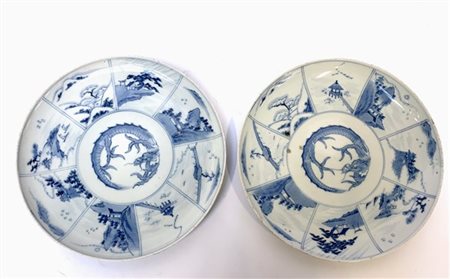 Coppia di piatti in porcellana bianca e blu decorati con draghi al centro e scena di paesaggio (d. cm 22) (difetti)