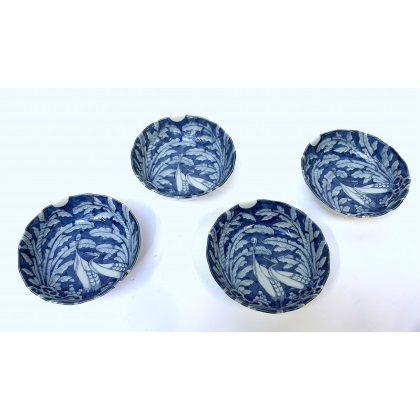 Quattro coppette in porcellana bianca e blu decorate con aironi (d. cm 14) (difetti)