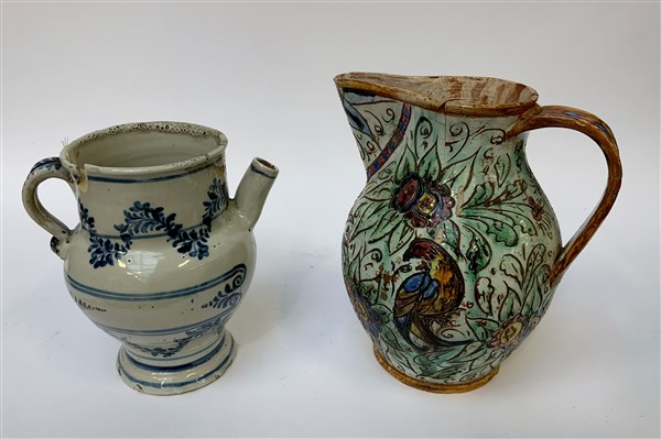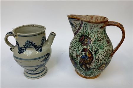 Lotto composto da due brocche in maiolica di epoche e con decori diversi, misure diverse (h max cm 30) gravi difetti e vecchi restauri