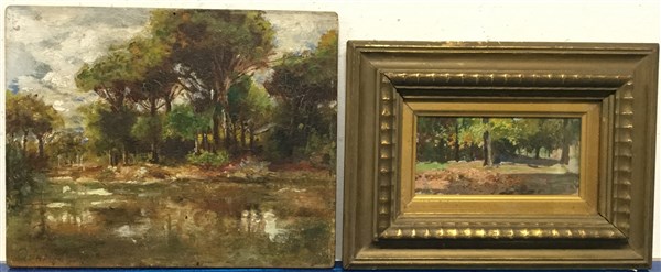 "Paesaggi boschivi" due dipinti ad olio di autori e misure diverse in cornice. Uno firmato Ricciardi (difetti)