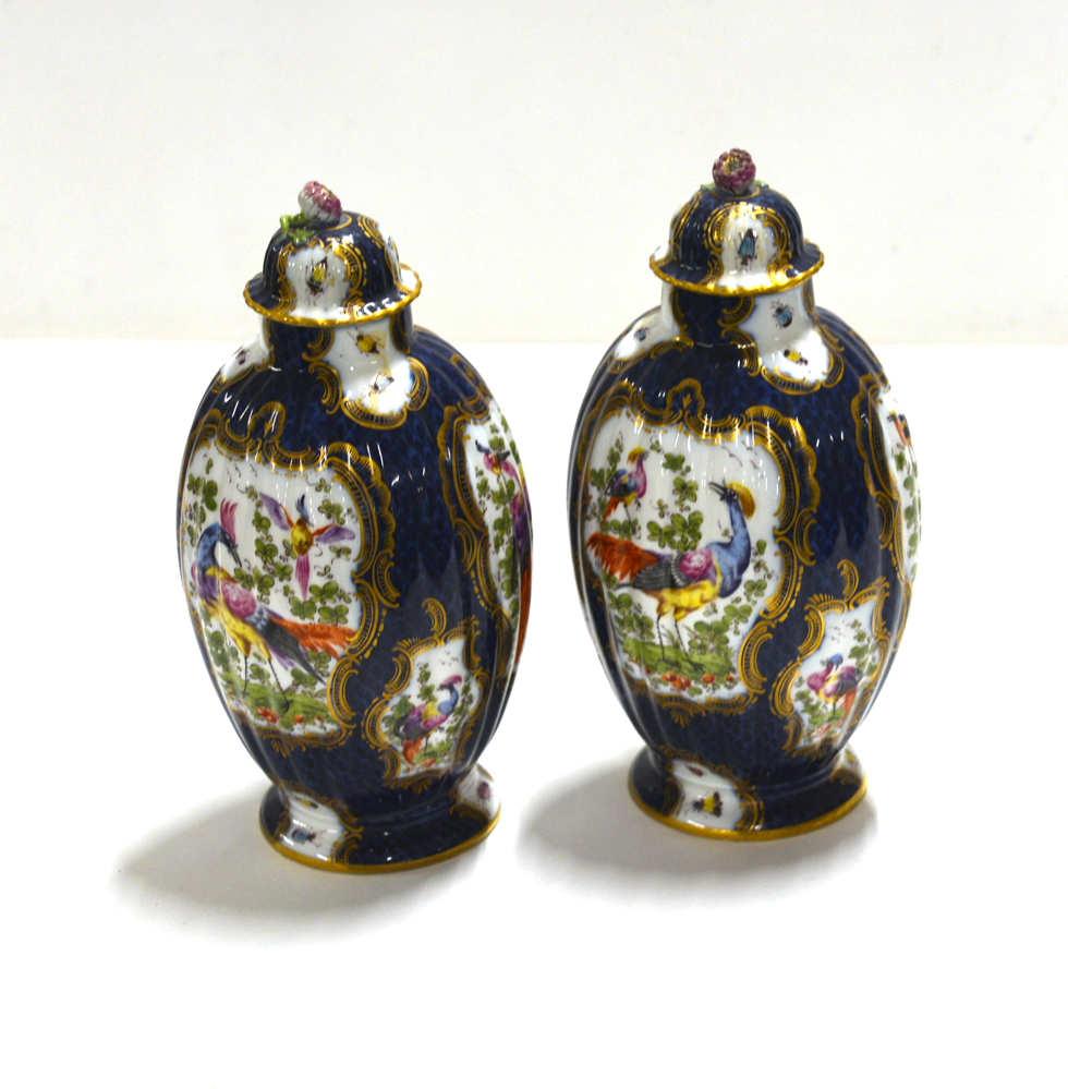Manifattura della prima meta del secolo XX, coppia di vasi con coperchio in porcellana a fondo blu decorata in policromia ad uccelli ij un paesaggio entro fregi dorati (h cm 26) (difetti)
