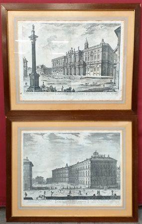 Coppia di incisioni del sec. XVIII raffiguranti veduta di Palazzo Borghese e veduta della Basilica di Santa Maria Maggiore in Roma, (cm 50x60) (difetti)