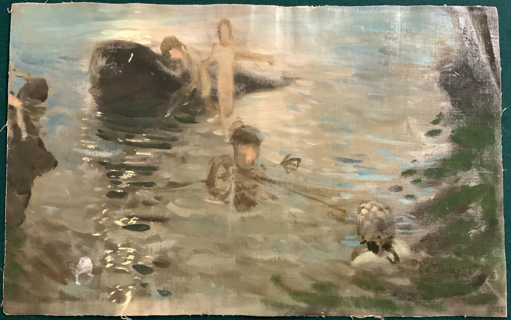 "Bagnanti", olio su tela (cm 29x45.5) firmato in basso a destra (difetti)