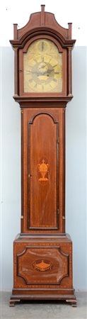 Orologio a cassa lunga in legno con cimasa, quadrante firmato a fascia con numeri romani sulla cimasa quadrantino per selettore della suoneria, angolari in bronzo dorato. Movimento con carica settimanale,suoneria delle ore, scappamento ad ancora (h cm 229) (difetti)