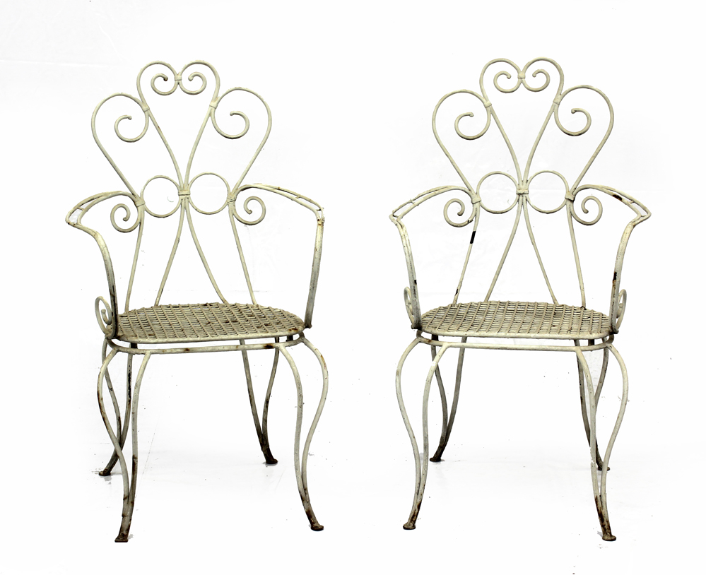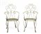 Coppia di poltrone da giardino in ferro battuto laccato bianco, braccioli e sch