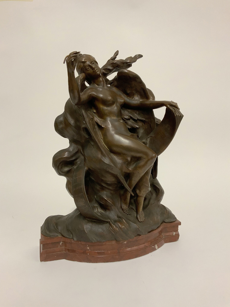 Scultura in bronzo. Francia, fine secolo XIX/inizio secolo XX. Firmato "J. Dercheu". (h cm 50) (difetti)