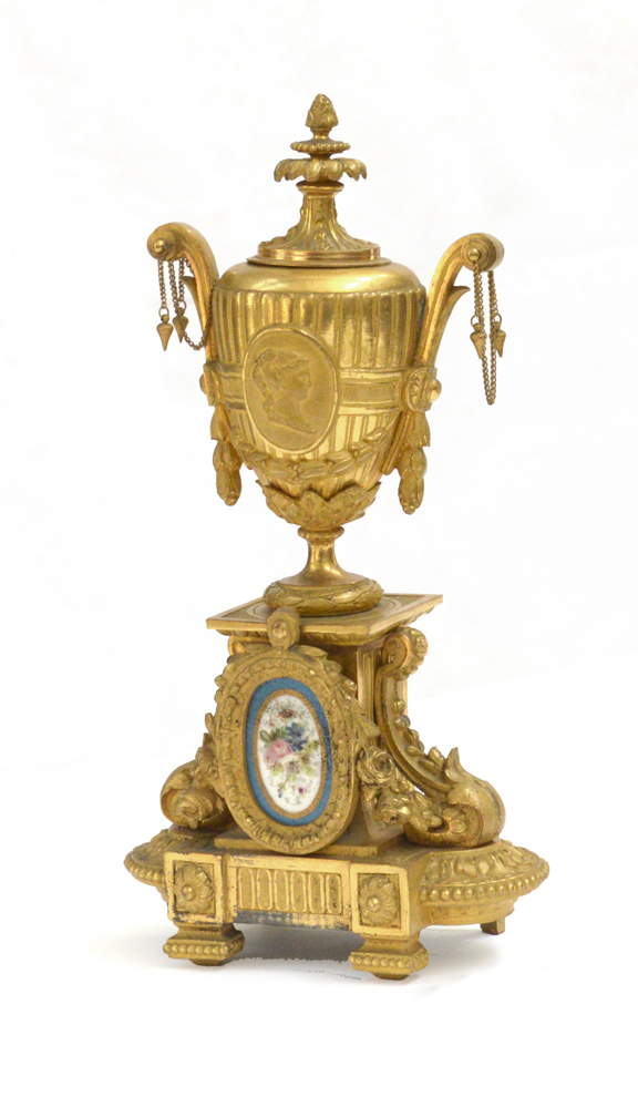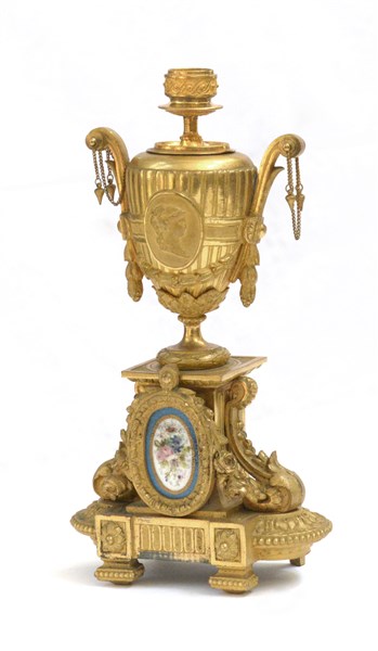 Vasetto reversibile a candeliere in bronzo dorato e cesellato a festoni, profili femminili, volute fogliate e fiori. Base decorata da placchetta in porcellana dipinta. Fine sec. XIX (h cm 31) (difetti)