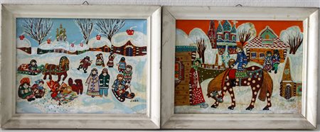 Luba coppia di dipinti Naif raffiguranti paesaggi con figure, acrilici su tela c