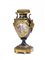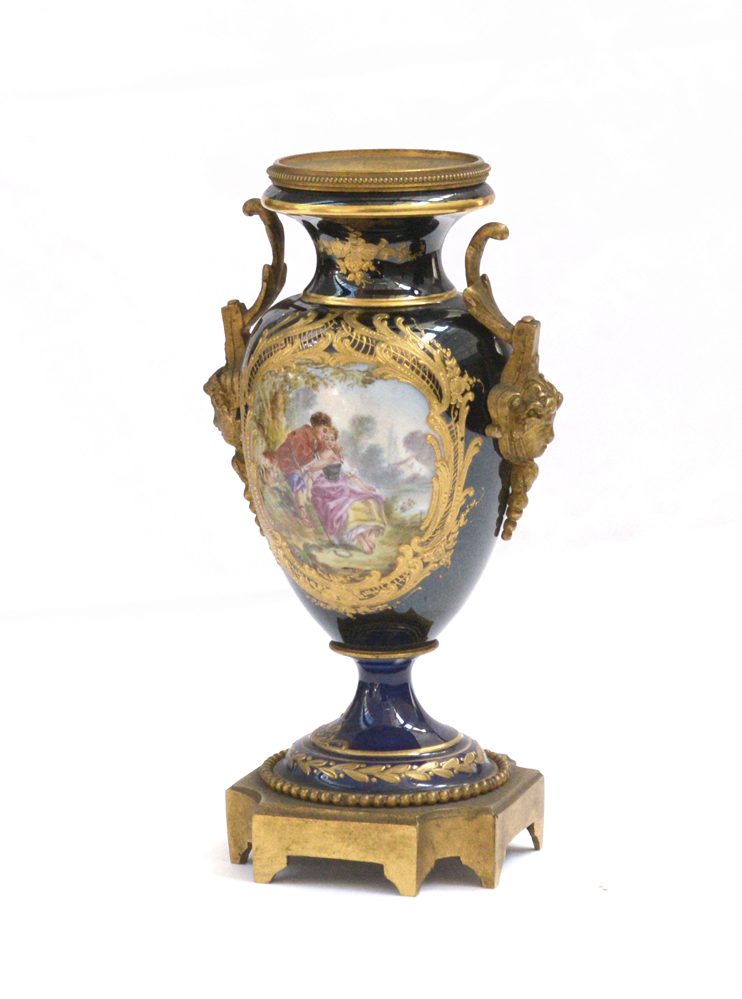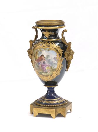 Manifattura di Sevres, sec. XX. Vaso biansato in porcellana a fondo blu decorato con scena galante e paesaggio in policromia, fregi dorati. Montato in bronzo dorato e cesellato (h cm 22) (difetti)
