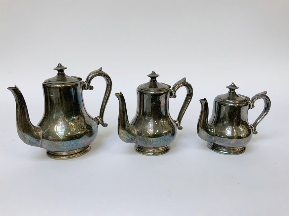 Servizio da tè e caffè ''egoista'' composto da teiera, caffettiera e lattiera in metallo argentato a corpo liscio recante monogramma (lievi difetti)