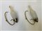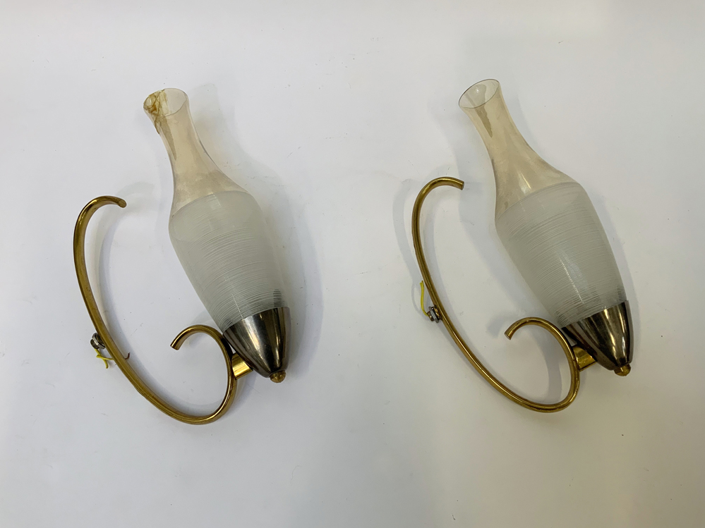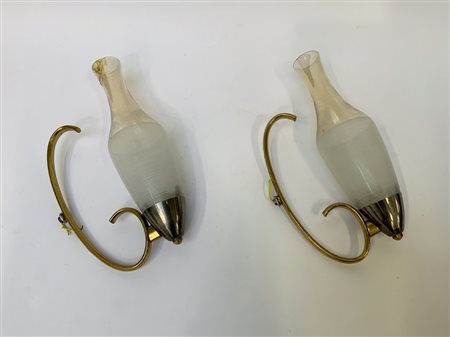 Coppia di appliques in ottone con paralume in vetro soffiato ambrato e iridato sulla superficie esterna, parte inferiore decorata a fasce orizzontali bianche. Italia, anni '50. (h cm 31) (gravi difetti)